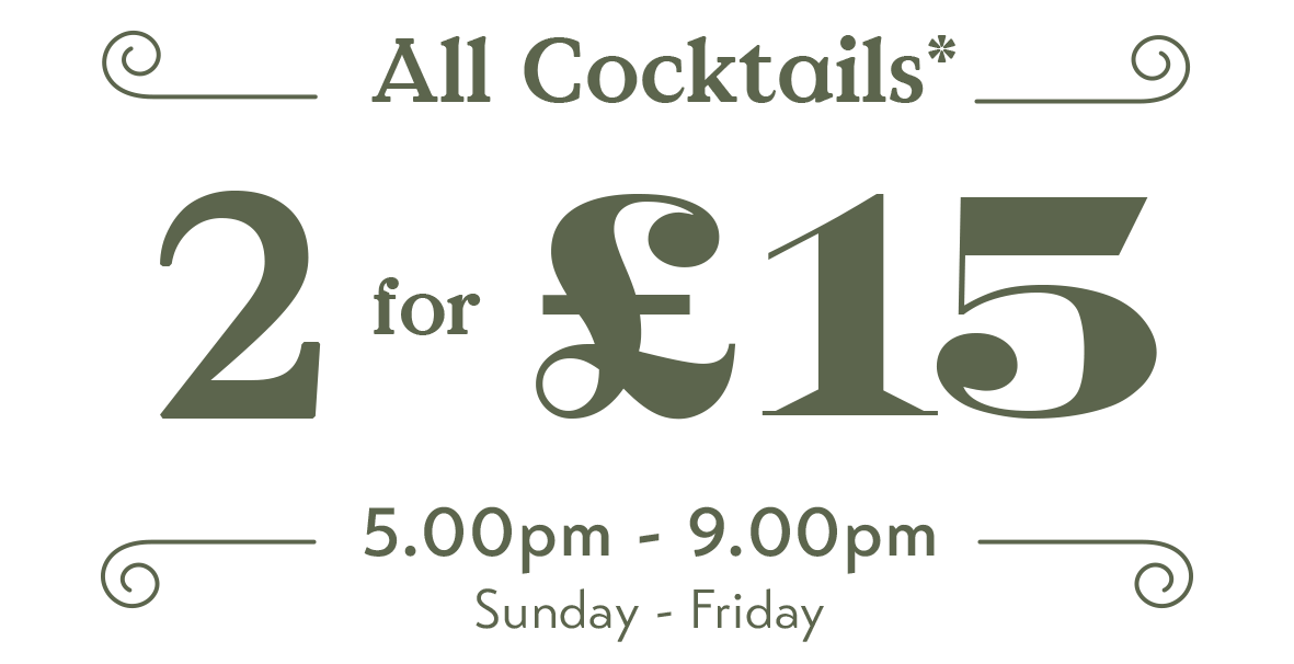 * not applicable on bank holidays. Management reserve the right to withdraw offer at any time.Our Cocktails